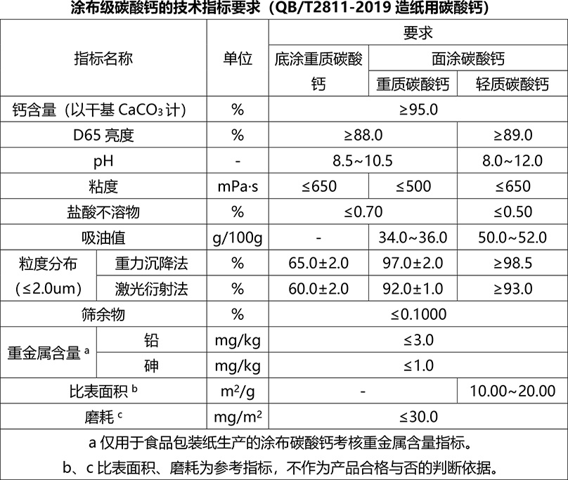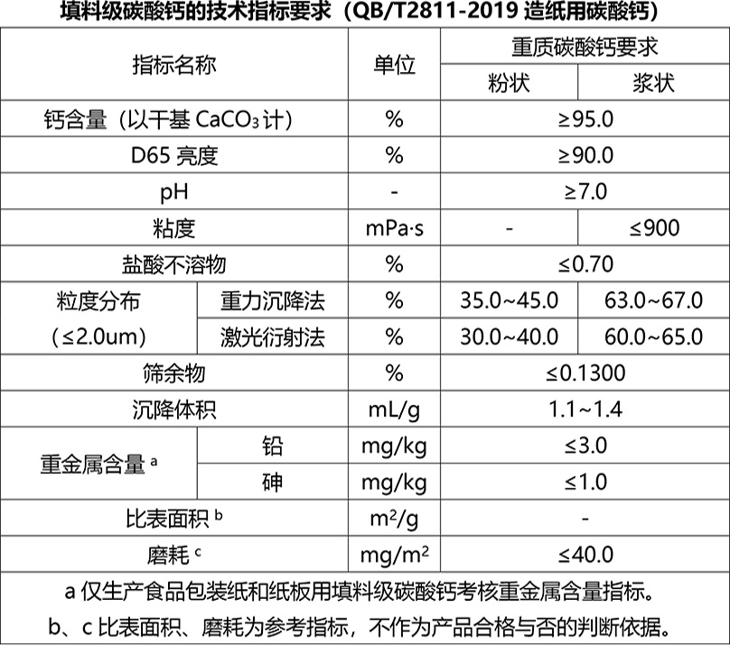 2020年4月1日,QB/T2811-2019造紙用碳酸鈣代替QB/T2811-2006造紙研磨碳酸鈣正式實(shí)施。依據(jù)標(biāo)準(zhǔn),造紙用碳酸鈣按產(chǎn)品用途分為填料級(jí)碳酸鈣、涂布級(jí)碳酸鈣。其中填料級(jí)碳酸鈣包括重質(zhì)碳酸鈣(研磨碳酸鈣)和輕質(zhì)碳酸鈣(沉淀碳酸鈣),涂布級(jí)碳酸鈣包括底涂碳酸鈣和面涂碳酸鈣。